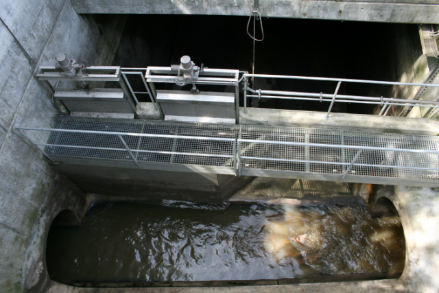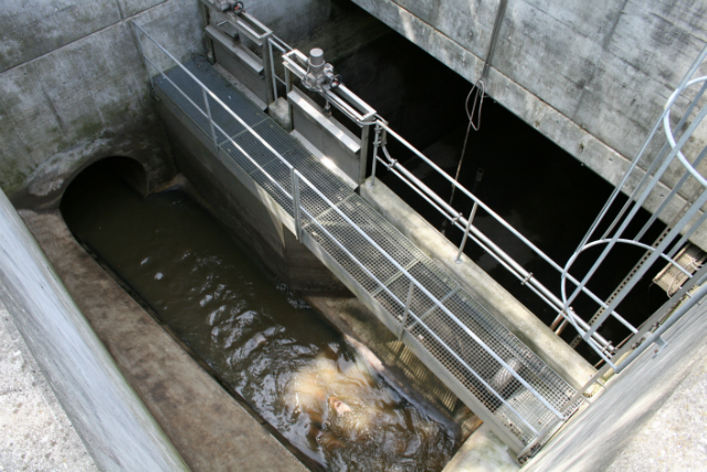 Reicht das Regenfangbecken nicht aus um die anfallende Wassermenge aufzufangen, wird das wasser über eine Überfallkante zum Hebewerk geleitet. Mittels Schneckenpumpe wird das Wasser in die Regenklärbecken befördert. Über einen Siebrechen wird das Regenwasser grob gereinigt, und in den Vorfluter geleitet.