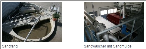Nach der Rechenanlage wird das Schmutzwasser zum Sandfang geführt, in welchen Sand aus dem Wasser ausgeschieden wird. Im Sandfang wird die Wassergeschwindigkeit so reduziert, dass sich Sand und Kieselsteine absetzen können. Sand und Kiesel werden mittels Pumpe vom Sandfangboden in den Sandwäscher gepumpt.